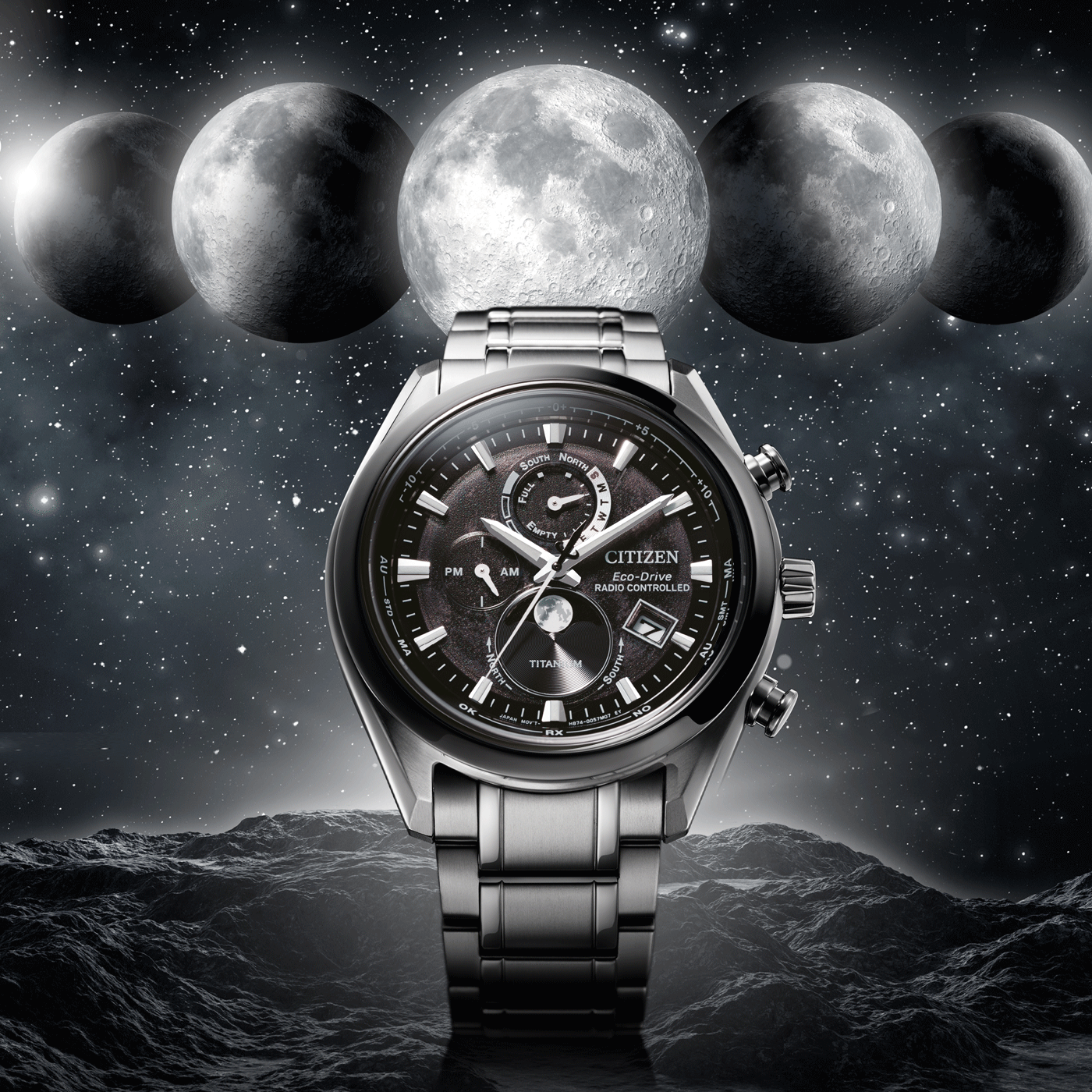 Montre Citizen avec lunes dans l'espace, Eco-Drive, radio-pilotée, titane.