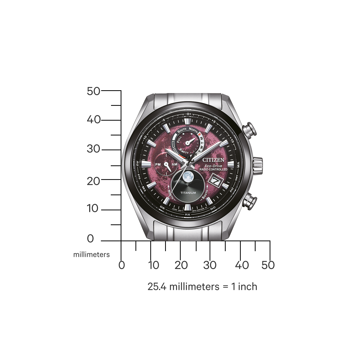 Chronographe radio-piloté doté du premier mouvement radio-piloté entièrement automatique au monde avec phase de lune et mécanisme lumineux. Boîtier et bracelet en Super Titanium™ (Duratect TIC), verre saphir et cadran rouge et noir avec structure lunaire. Équipé du calibre H874 avec fonction Eco-Drive, réception radio, heure mondiale, phases de lune, affichage 24 heures, date et étanchéité à 10 bars. Diamètre du boîtier : 43 mm, largeur des cornes : 22 mm.