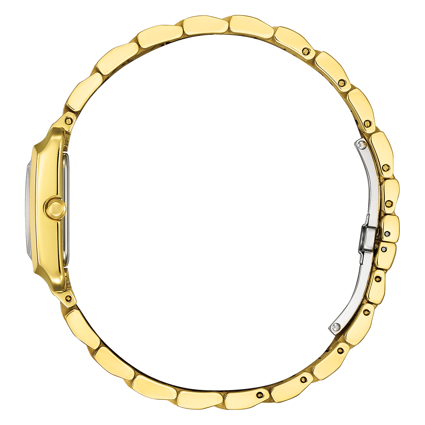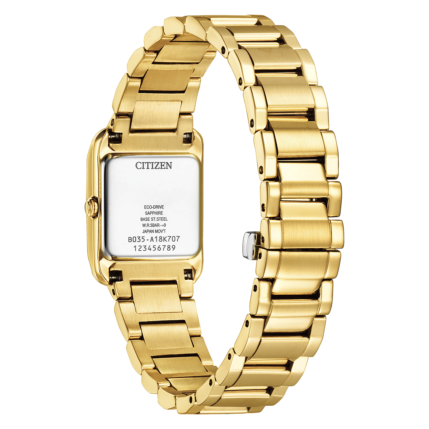 Modern ladies' watch with gold-colored, rectangular stainless steel case and matching bracelet, sapphire glass and mother-of-pearl dial with blue hands. Equipped with caliber B035 with Eco-Drive movement and 5 bar water resistance. Case size: 21.5 x 28.4 mm.