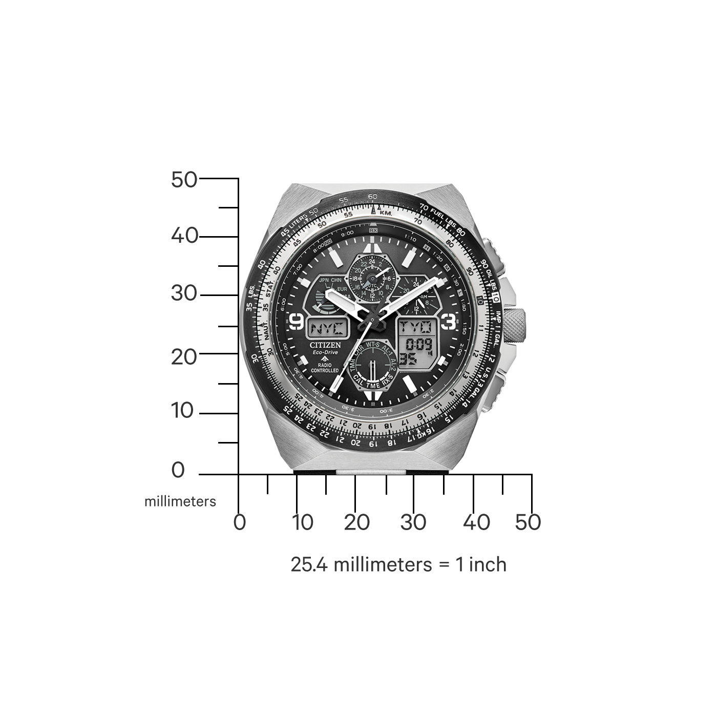 Feature-packed pilot's watch with analog and digital display on the black dial. With stainless steel case and black leather strap, multifunction bezel and anti-reflective sapphire glass. Equipped with the U680 caliber with Eco-Drive movement, radio controlled, world time, 24-hour display, day/date, various calculation functions and 20 bar water resistance. Case diameter: 45 mm.